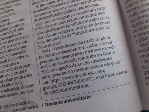 Hoje compramos o Público (€1.60). Se o compraram também, podem ver na página 54 que existe um artigo sobre " inconstitucionalidade da lei do casamento homossexual". Mas isso não é o maior problema (também o é... ): o pior vem no fim do artigo onde têm uma nota informativa.